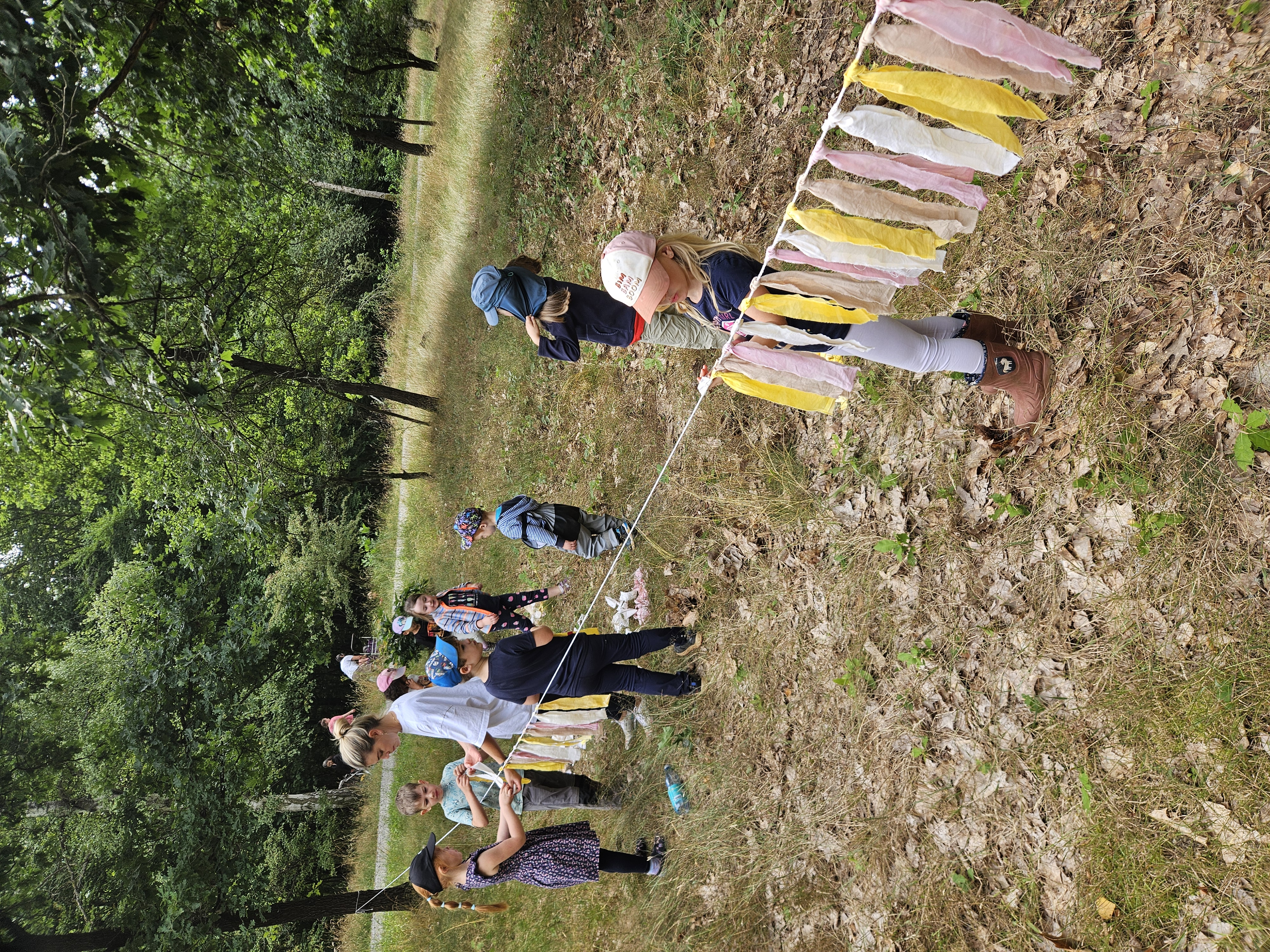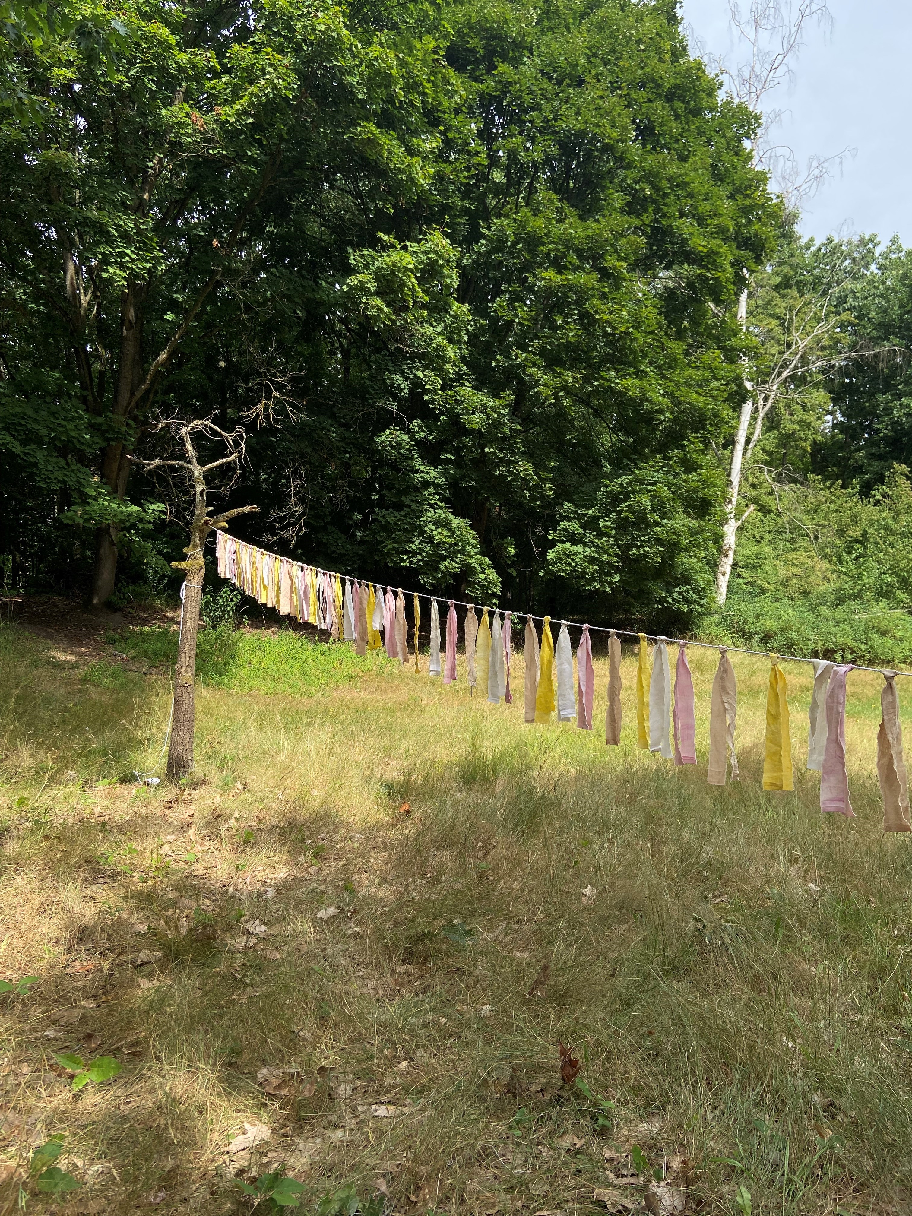 Zum Abschluss wurden die gefärbten Tücher in Stücke gerissen und zu einer langen Girlande zusammengeknotet. Die Kinder waren stolz auf das gemeinsame Werk – ein Projekt, das Natur, Kreativität und Gemeinschaft miteinander verbunden hat.