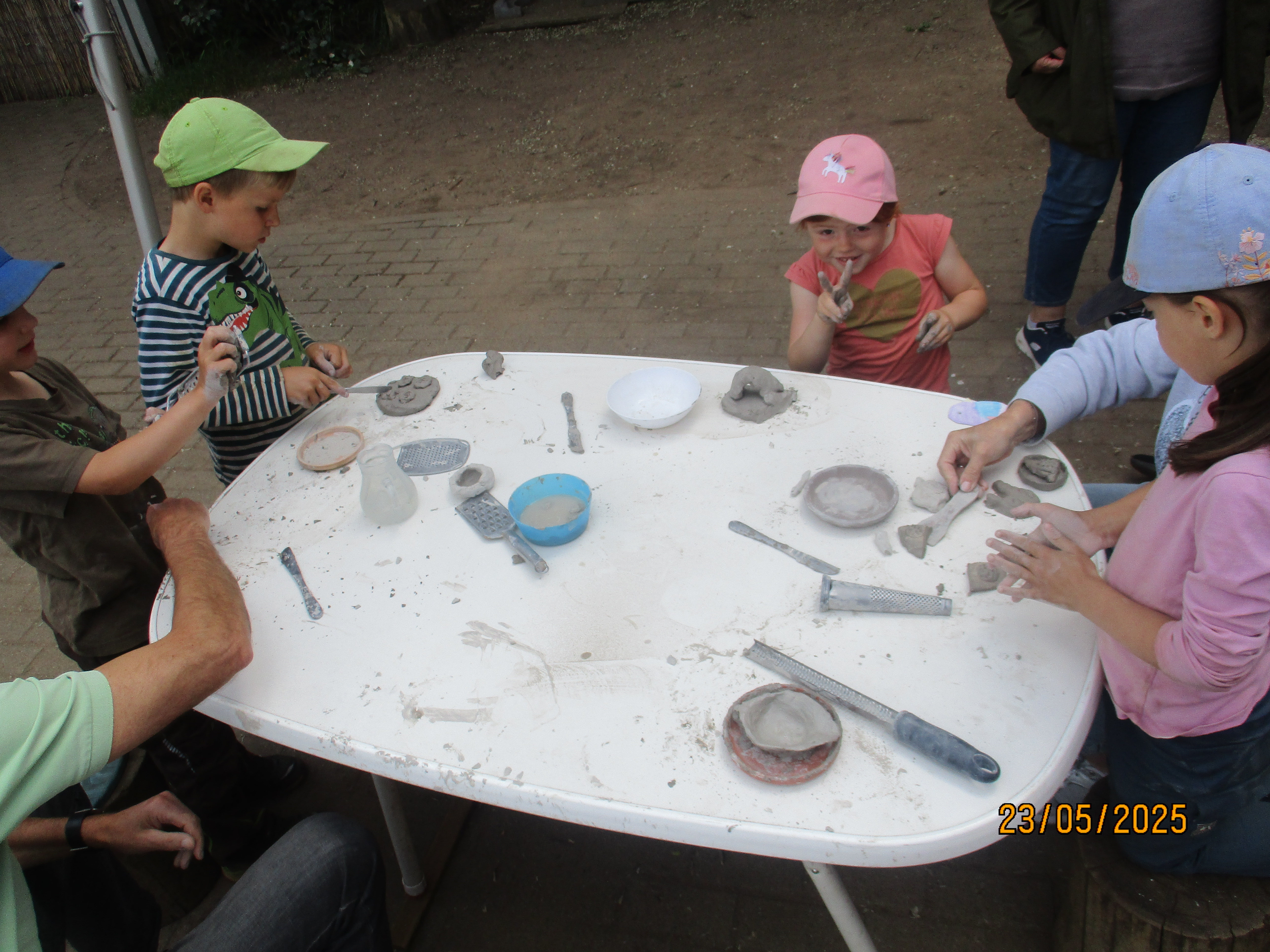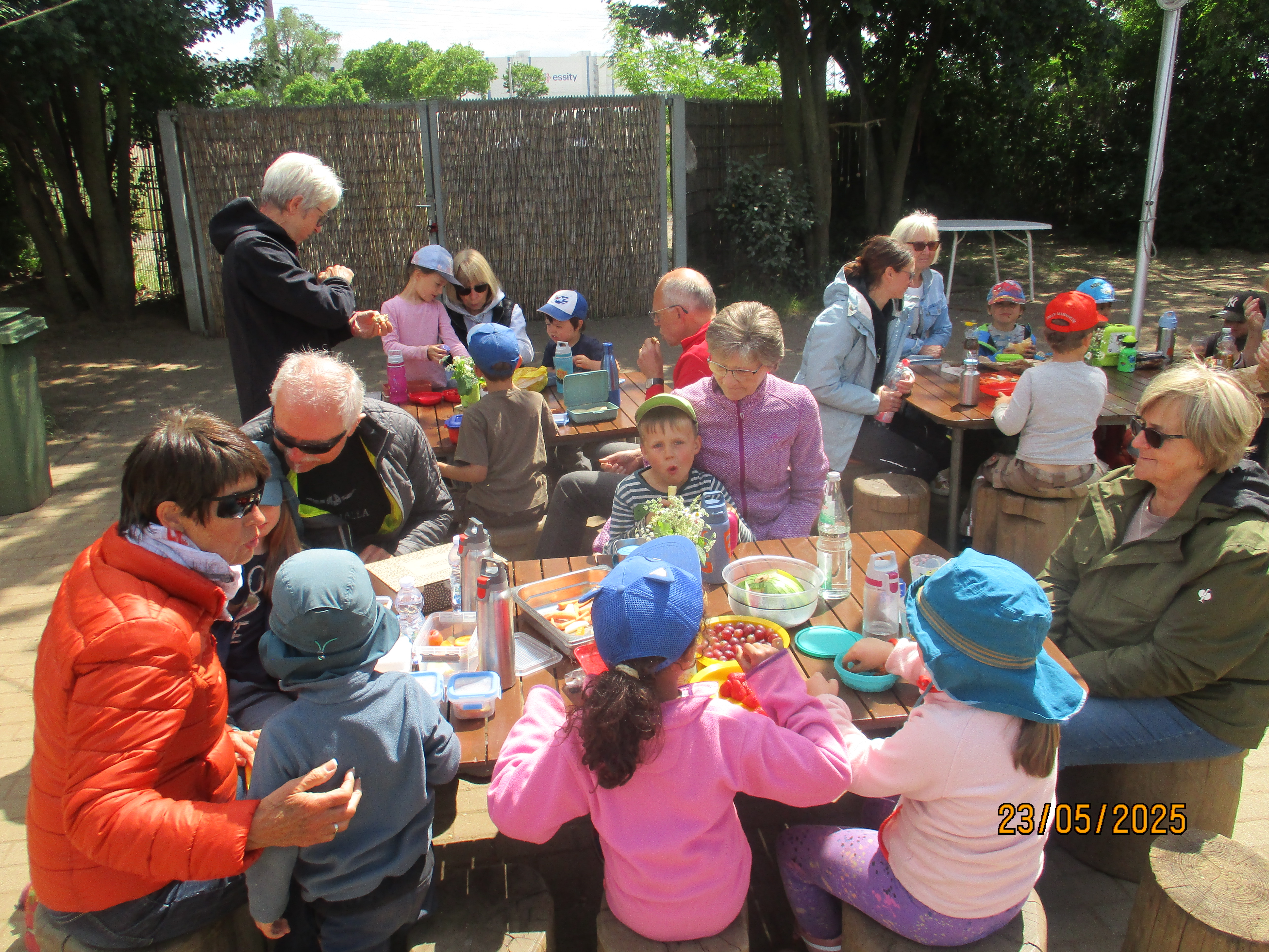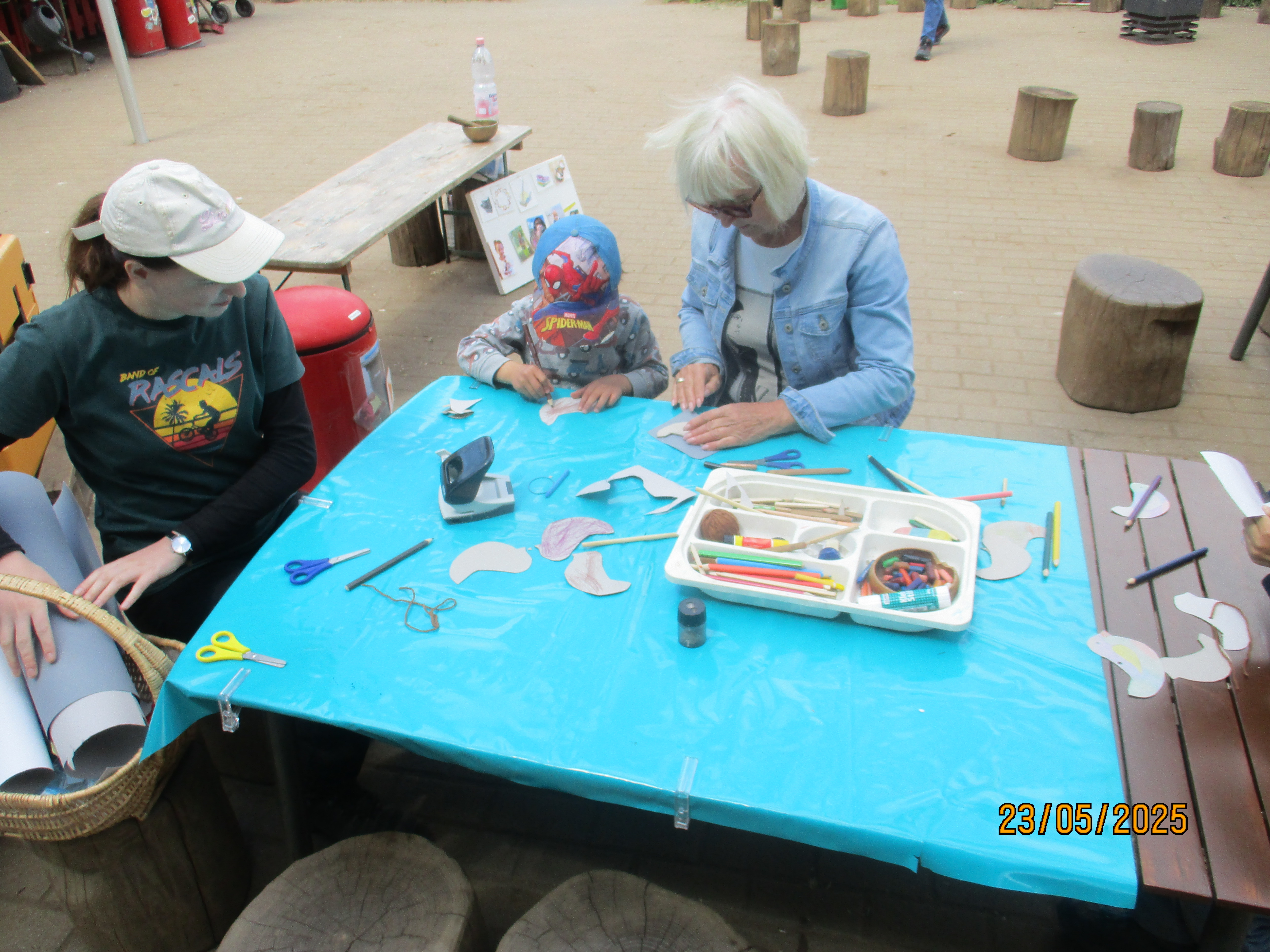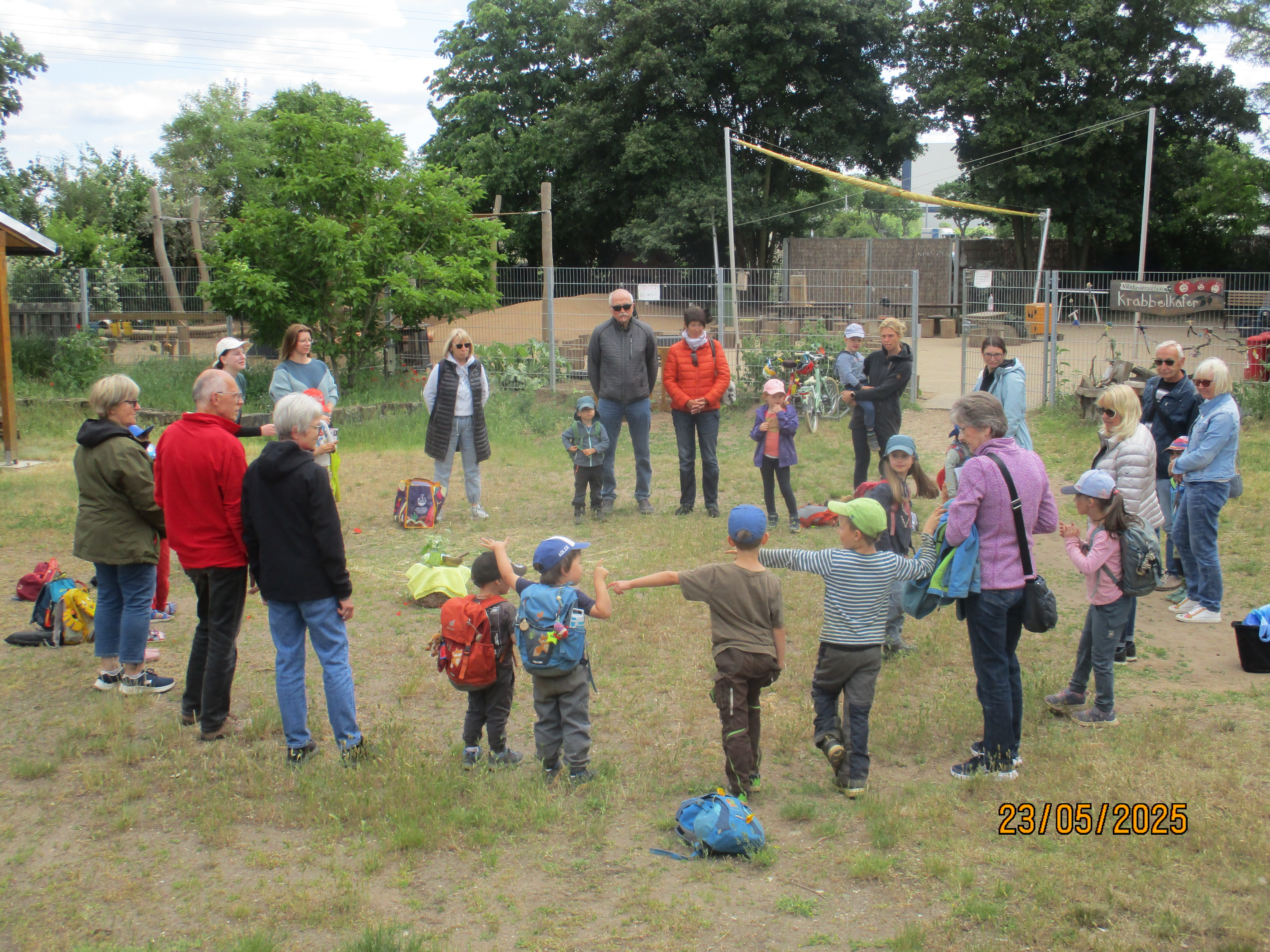 Am Freitag, den 23.05.2025, war ein ganz besonderer Tag. Es gab Besuch bei uns im Kindergarten. Viele Großeltern verbrachten den Nachmittag gemeinsam mit ihrem Enkelkind im Naturkindergarten. Die Kinder und Großeltern durften sich auf verschiedene Stationen freuen: Arbeiten mit Ton, ein kreatives Bastelangebot, Entdeckertour im Lehrgarten und vieles mehr. Bei jeder Station herrschten reges Treiben und ein frohes Schaffen. Alle arbeiteten Hand in Hand, es wurde viel erzählt, gelacht und auch die Sonne ließ sich an diesem Tag blicken.
