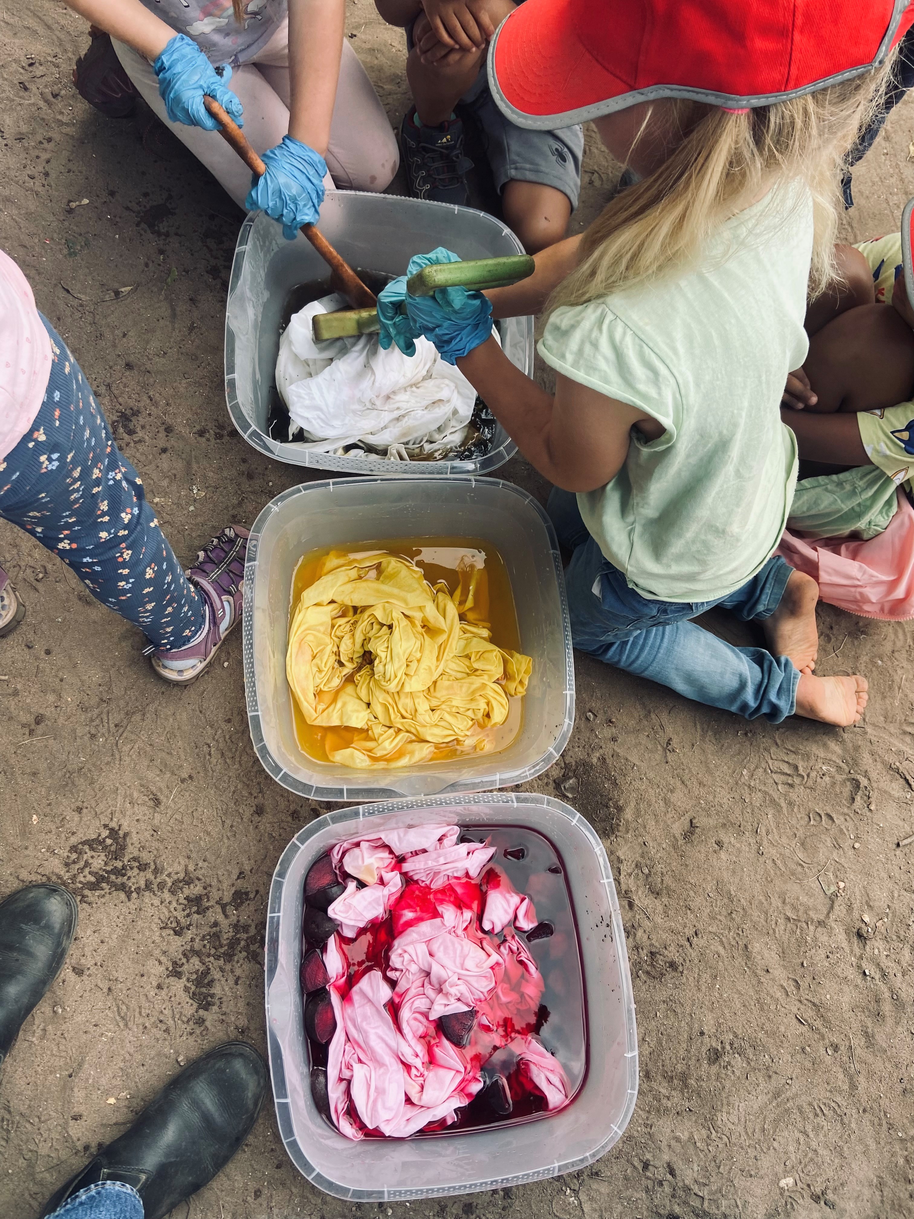 Fazit: Das Färben mit Naturmaterialien war nicht nur lehrreich, sondern auch sinnlich und verbindend. Die Kinder erlebten den Prozess vom Rohmaterial bis zum fertigen Produkt mit allen Sinnen – und haben ganz nebenbei ein Gefühl für Nachhaltigkeit und die Schönheit natürlicher Farben bekommen.
